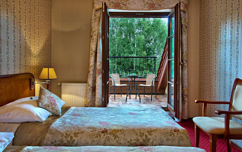 Pokój typu standard plus - Poranna kawa na tarasie? Dla gości, którzy lubią rozpocząć dzień od porannej kawy w otoczeniu zieleni. Oprócz standardowego wyposażenia pokój posiada taras, na którym wśród koron drzew poranna kawa smakuje jeszcze bardziej. Pokój wyposażony jest w dwa oddzielne łóżka.