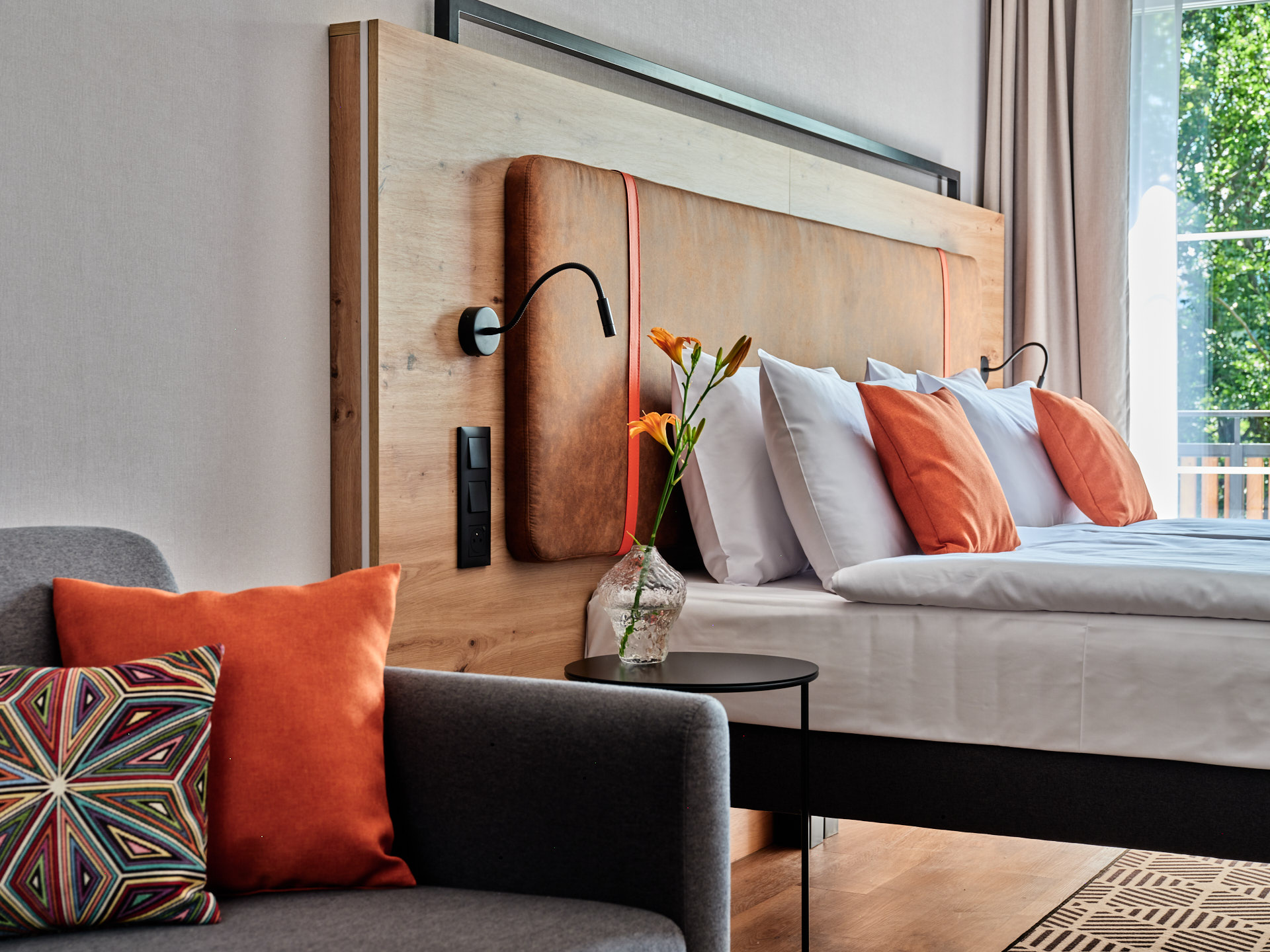 Wnętrza Bergo Resort & Spa zachwycają energetycznymi kolorami i przytulnymi materiałami wykończeniowymi, które tworzą wyjątkową atmosferę relaksu. Pokoje zostały zaprojektowane z myślą o maksymalnej funkcjonalności, wyposażone w wysokiej jakości meble oraz klimatyzację, zapewniając komfort na najwyższym poziomie. Hotel oferuje 140 stylowych pokoi, w tym 24 przestronne apartamenty z aneksem kuchennym, idealne dla gości szukających jeszcze większej wygody i swobody.