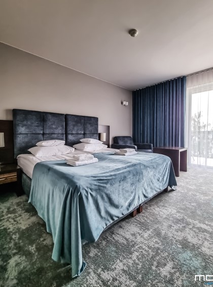 Hotel oferuje duży wybór pokoi w tym apartamentów o zróżnicowanym standardzie. Za oknami można podziwiać szmaragdowe Jezioro Powidzkie lub tereny Powidzkiego Parku Krajobrazowego. Klimatyzowane, komfortowo umeblowane, duże pokoje z łazienkami i wygodnymi łóżkami sprzyjają udanemu wypoczynkowi po całym dniu pełnym wrażeń.